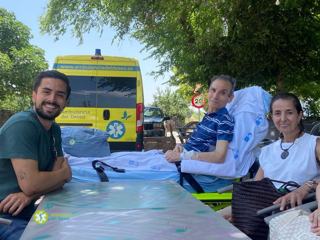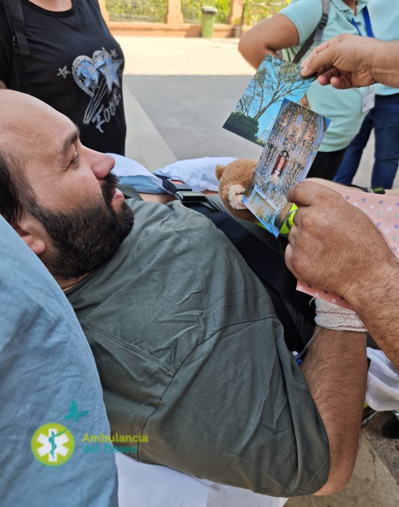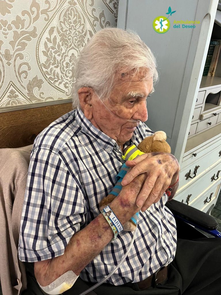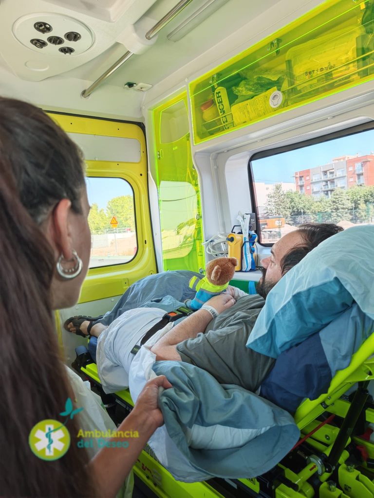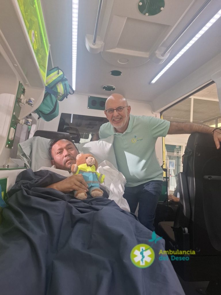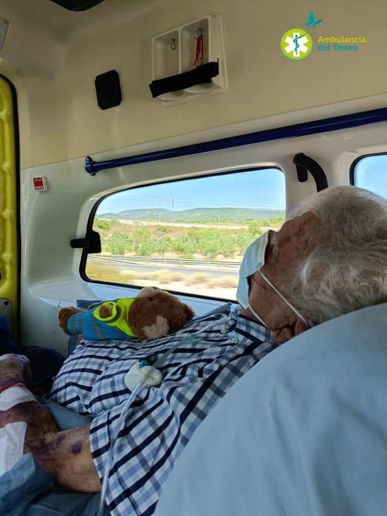 Durante el viaje en ambulancia, iba arropado por su hijo y nuestro enfermero. Fue un trayecto duro, pero su sonrisa no se borraba; su mirada irradiaba luz y felicidad.