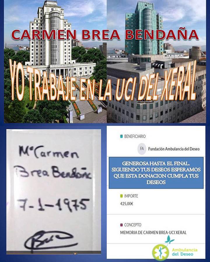 Desde la Fundación Ambulancia del Deseo queremos rendir homenaje a María Carmen Brea Bendaña, quien trabajó durante 43 años como auxiliar de enfermería en la UCI del Hospital Xeral de Vigo. Su familia la describe como una mujer generosa, de las que mueven cielo y tierra para ayudar a quien lo necesite. Entregada a sus pacientes, a sus compañeros, a sus seres queridos… a todos.