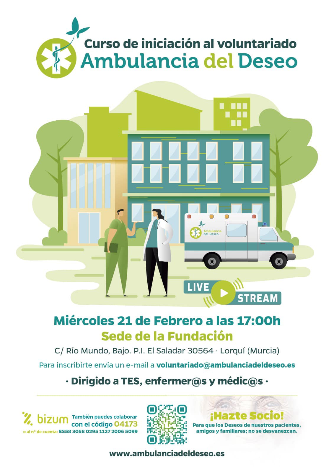 Curso de iniciación de Voluntariado de la Fundación Ambulancia del Deseo España. Será el próximo 21 de Febrero a las 17:00h en la sede de la Fundación.