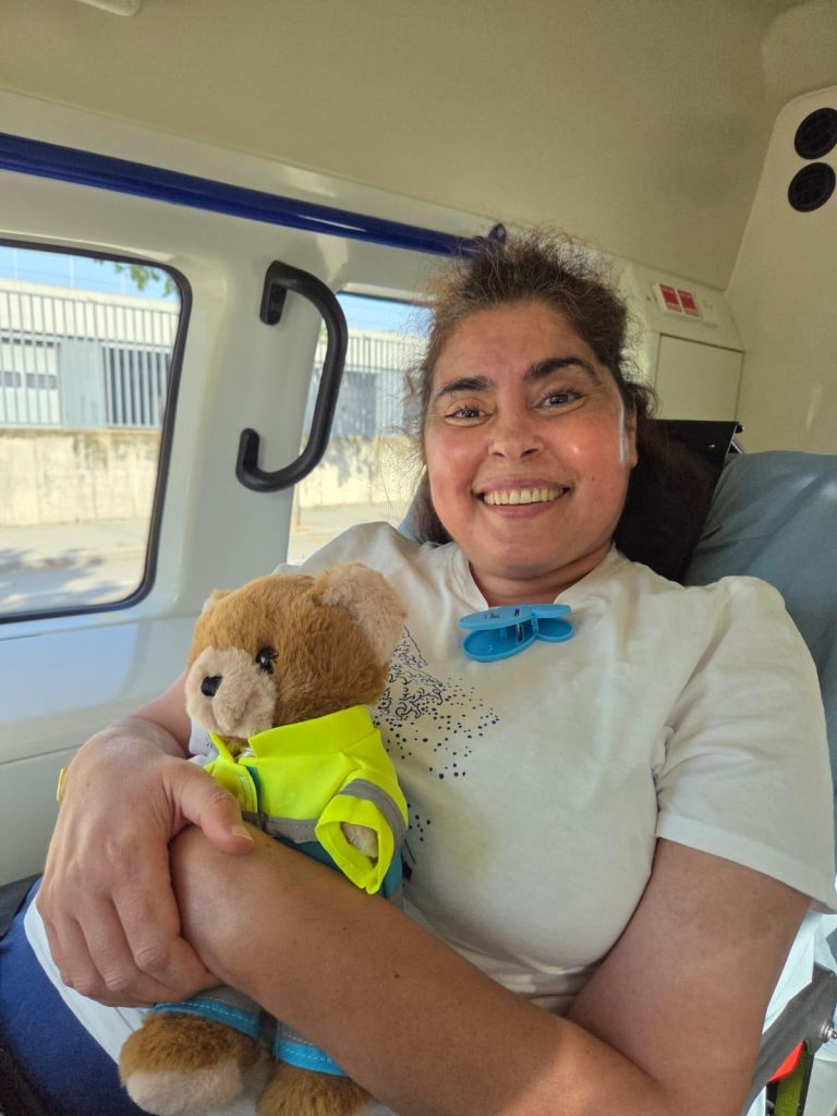 Fátima, ingresada en el hospital, soñaba con volver a ver el mar como cuando jugaba de niña en su pueblo. Una mañana la recogimos junto a su inseparable hermano y la llevamos hasta la playa de Gandía, donde pudo disfrutar de momentos mágicos frente a ese mar que tanto anhelaba.