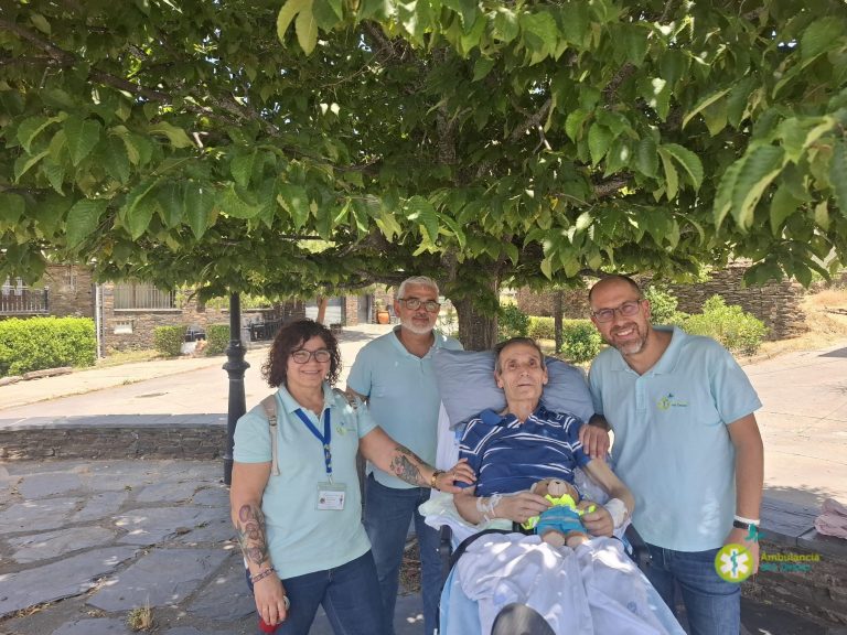 Durante el viaje en ambulancia, iba arropado por su hijo y nuestro enfermero. Fue un trayecto duro, pero su sonrisa no se borraba; su mirada irradiaba luz y felicidad.