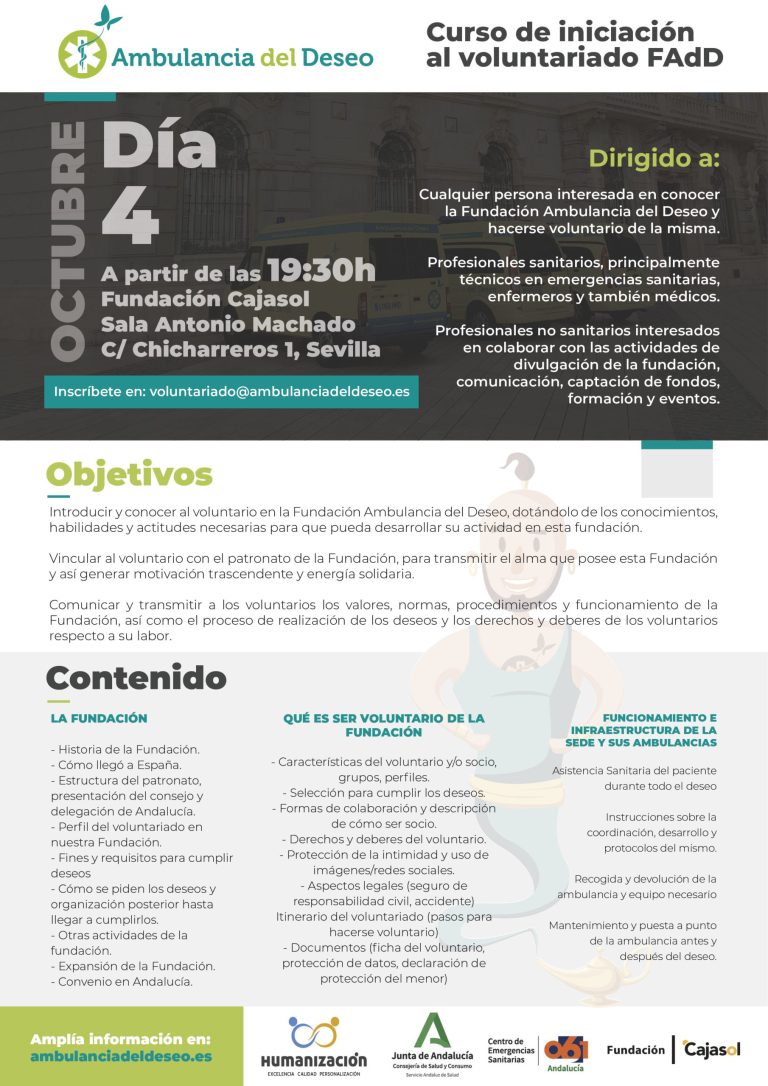 ✅ Si estás interesado, te esperamos el día 4 de Octubre a las 19:30h en la Fundación Cajasol, en la Sala Antonio Machado en Sevilla. Envía un email 📧 a: voluntariado@ambulanciadeldeseo.es indicando tus datos personales y profesión.